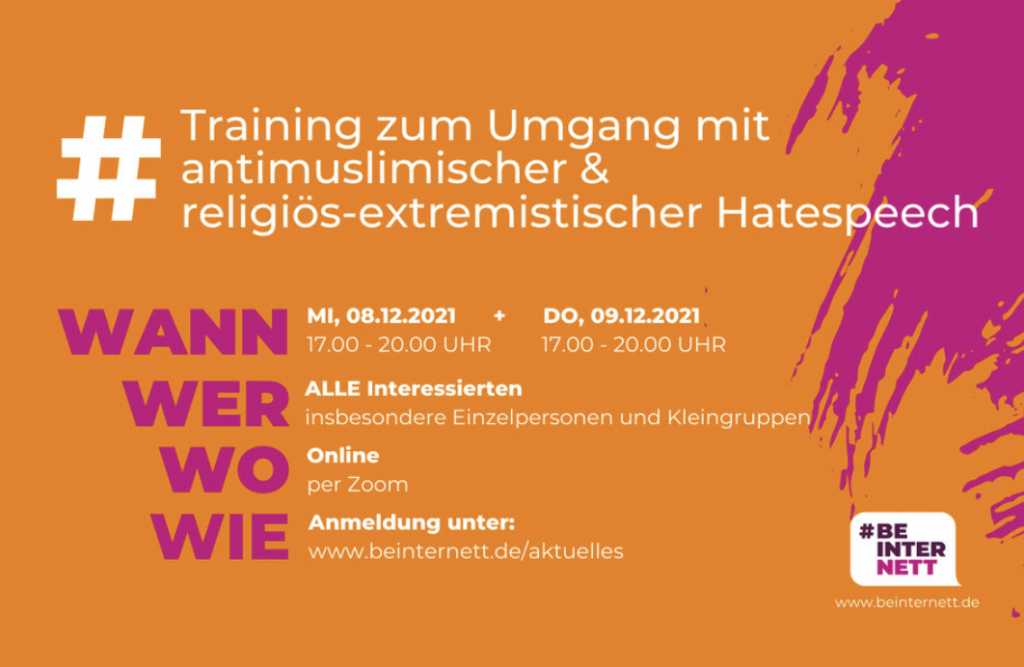 Wer: Das Training ist offen für alle Interessierten. Unsere Trainings richten sich primär an junge muslimische Erwachsene und haben einen Fokus auf antimuslimische und religiös-extremistische Hate Speech. Dennoch ist das Training offen für alle, die sich für dieses Thema interessieren. Für dieses Training können sich sowohl Einzelpersonen als auch Kleingruppen (bis sieben Personen) anmelden.