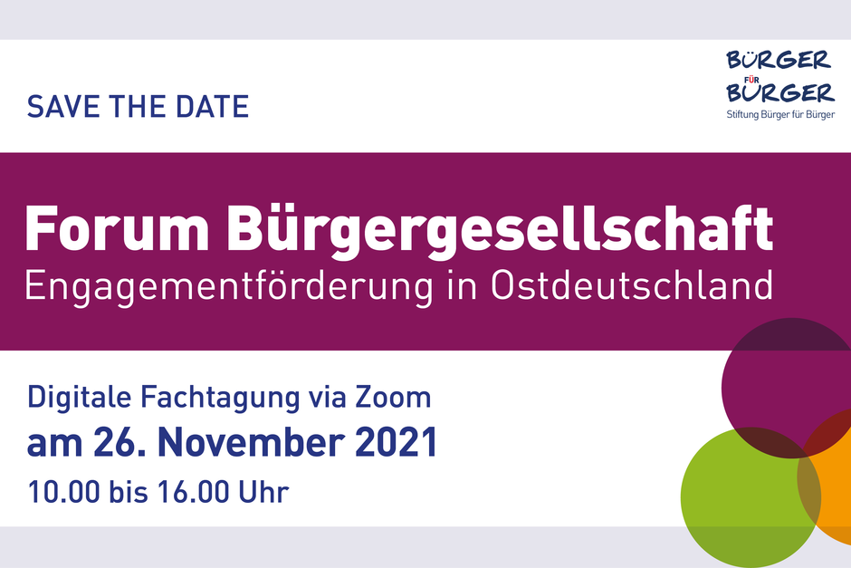Das Forum Bürgergesellschaft 2021 findet als länderübergreifende Fachtagung in digitaler Form statt. Die Veranstaltung bringt Entscheidungsträger*innen und Engagierte aus Zivilgesellschaft, Wissenschaft und Politik miteinander ins Gespräch. Dieses Jahr steht dabei das Thema „Engagementförderung in Ostdeutschland“ im Fokus.