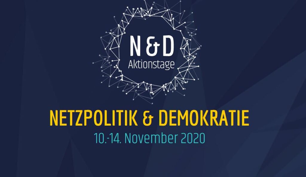 Das Internet ist überall. Warum überlassen wir es anderen, die Regeln zu machen? Bundesweite Aktionstage für Netzpolitik & Demokratie: Für alle, die den digitalen Teil ihres Alltags mitgestalten wollen. Vom 10. bis 14. November 2020 deutschlandweit, veranstaltet von den Zentralen für politische Bildung und ihren Partnern.