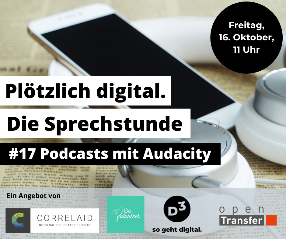 Für viele die beste Begleitung beim Zugfahren, Kochen, Putzen oder dem Spaziergang: Der Podcast! Mittlerweile nutzen auch immer mehr gemeinnützige Initiativen das Format um ihr soziales Wirken zu kommunizieren. Jasmin von CorrelAid Podcast Team zeigt euch wie ihr mit dem Open Source Tool „Audacity“ eigene Audioinhalte bearbeiten könnt und somit die Grundlage für euren eigenen Podcast legt.