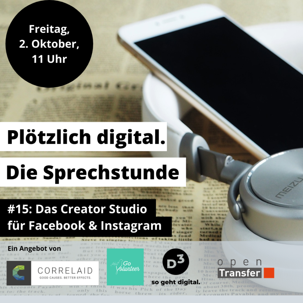 Ihr habt ganz viele Fragen, weil plötzlich eure gesamte Zusammenarbeit digital abläuft? Kommt in unsere digitale Sprechstunde! Eigentlich seid ihr sonst meistens im Büro und eure Teamtreffen finden von Angesicht zu Angesicht statt? Was passiert mit den geplanten Workshops und Konferenzen? In Corona-Zeiten müssen viele soziale Organisationen plötzlich von 0 auf 100 ins mobile und dezentrale Arbeiten kommen. Der Turbo-Digitalisierungsprozess wirft viele Fragen auf, auf die es Antworten braucht – schnell und passend zu den eigenen Herausforderungen und Bedarfen. Dabei möchten wir euch helfen! Mit Plötzlich digital: Die Sprechstunde geben wir euch in den kommenden Wochen jeden zweiten Freitag um 11 Uhr einen virtuellen Raum, um gemeinsam mit anderen etwas Neues kennenzulernen. Mit unseren Digital-Expert:innen könnt ihr euch per geteiltem Bildschirm Kollaborationstools und Videokonferenz-Programme gemeinsam anschauen und eure Fragen diskutieren. Die nächste Session: Creator Studio: Community Management auf Social Media (Freitag, 2. Oktober 2020, 11 Uhr) Gutes Community Management auf Social Media ist vor allem eins: Arbeit. Wer aber sowieso schon aktiv bei Instagram, Twitter oder den anderen Social Media Plattformen ist, viel Zeit und ehrliches Interesse für sein Thema hat, wird mit ein wenig Fleiß schnell belohnt. Dominique von GoVolunteer zeigt euch, wie ihr mit „Creator Studio“ umgeht – und gibt praktische Tipps zum Nachmachen.